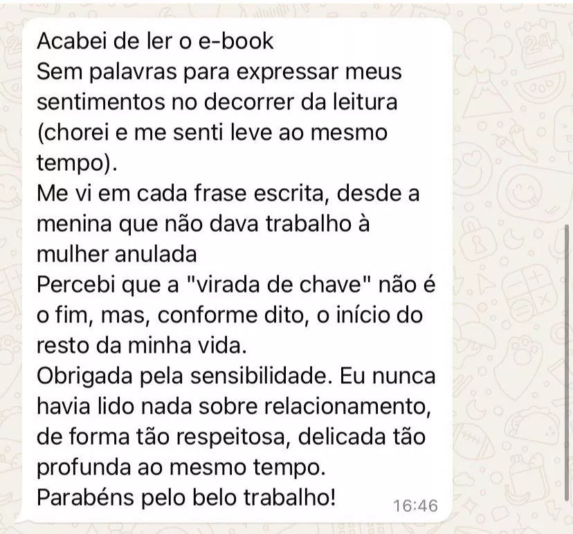 Nele, você vai encontrar 16 textos acolhedores, mas com reflexões profundas, que te ajudam a dar nome ao que sente, enxergar com mais verdade a relação que vive, resgatar sua história como mulher e começar a traçar novos caminhos — com mais firmeza e menos culpa.