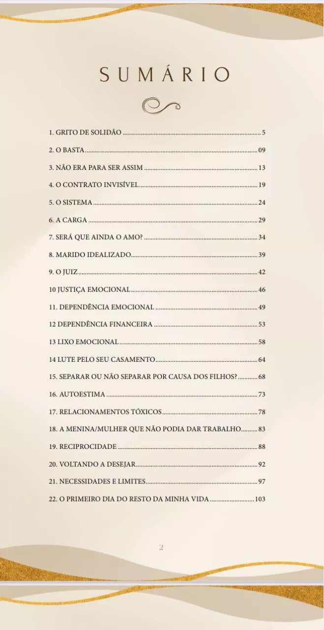 Através de 22 textos que abordam temas como dependência financeira e emocional, filhos, amor, sobrecarga e outros pontos sensíveis, você será guiada para uma análise profunda sobre seu casamento e sobre você mesma, para finalmente tomar uma decisão com mais lucidez, coragem e paz.